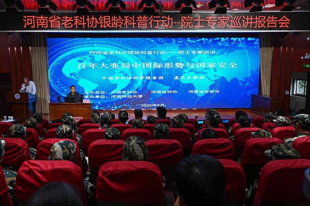 9月18日,河南科技大学举办河南省老科协银龄科普行动——院士专家巡讲报告会,中国老科协报告团成员、北京大学特聘教授孟庆全作题为《百年大变局中国际形势与国家安全》的专题报告会。