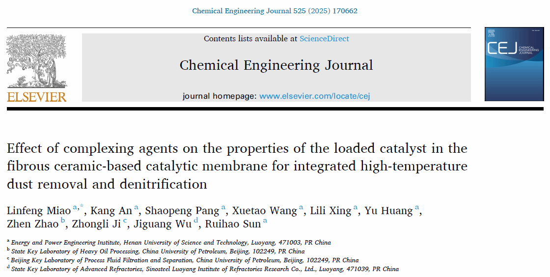 校新闻中心讯 近日,我校车辆与交通工程学院王学涛教授团队成员苗林丰博士(A类博士人才)在国际权威期刊《Chemical Engineering Journal》(中国科学院一区Top,IF: 13.2)上发表题为“Effect of complexing agents on the properties of the loaded catalyst in the fibrous ceramic-based catalytic membrane for integrated high-temperature dust removal and denitrification”的研究论文。苗林丰博士为第一作者和通讯作者,河南科技大学为论文第一署名单位。