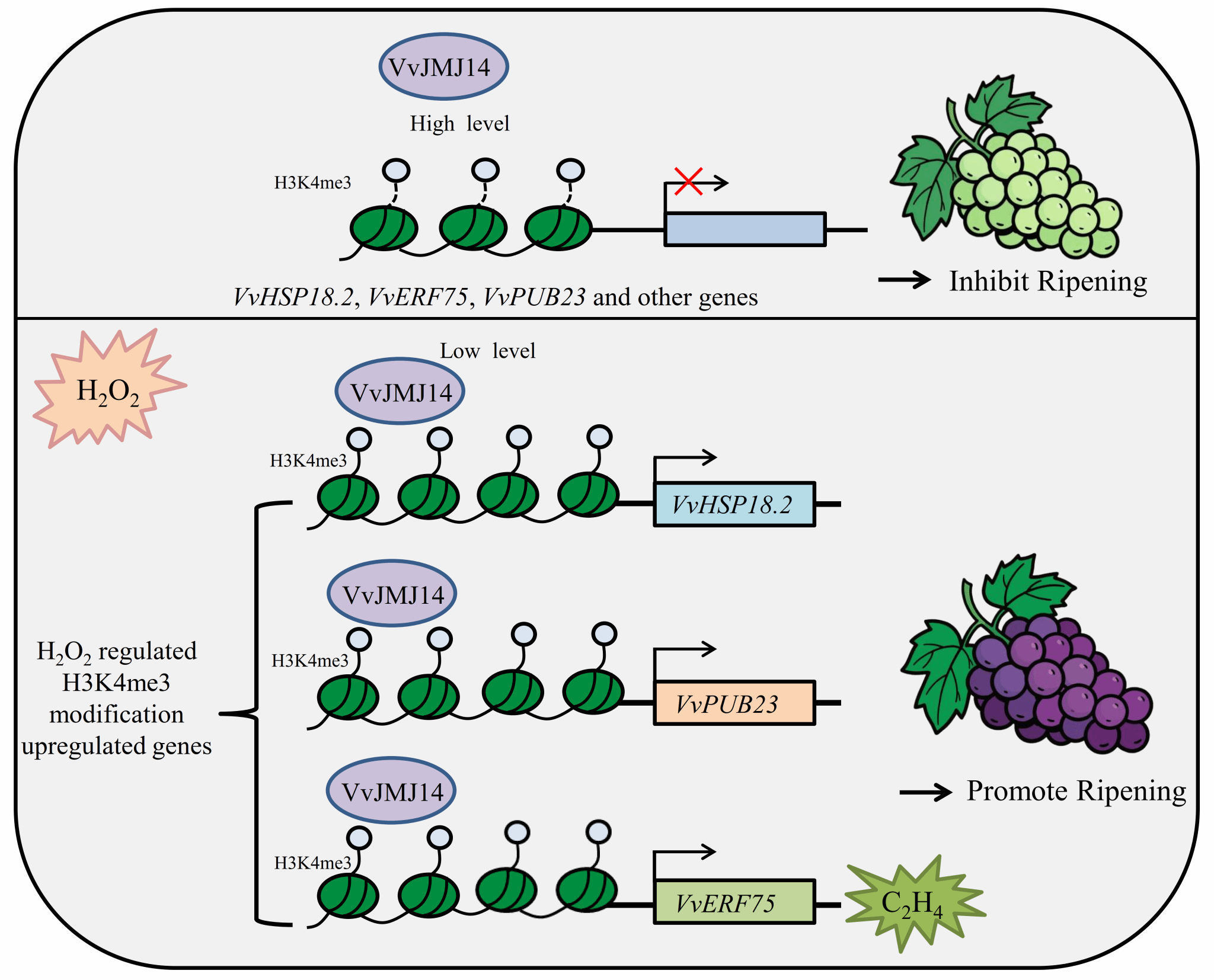 本研究通过整合H₂O₂处理后葡萄果实的抗H3K4me3的ChIP-seq与RNA-seq数据,系统解析了H₂O₂处理后果实中组蛋白H3K4me3修饰的动态变化。研究鉴定到一个受H₂O₂下调表达的组蛋白去甲基化酶基因VvJMJ14,用pIR瞬时转化体系在葡萄果实中进行了功能验证,证明其负调控葡萄果实成熟。进一步研究发现,下调表达的VvJMJ14通过提升H3K4me3在VvHSP18.2、VvERF75和VvPUB23等关键成熟相关基因启动子区的富集水平,促进这些基因的转录,从而正向调控H₂O₂诱导的葡萄果实成熟进程。该研究为理解活性氧信号与表观遗传修饰互作调控果实发育提供了新视角。
