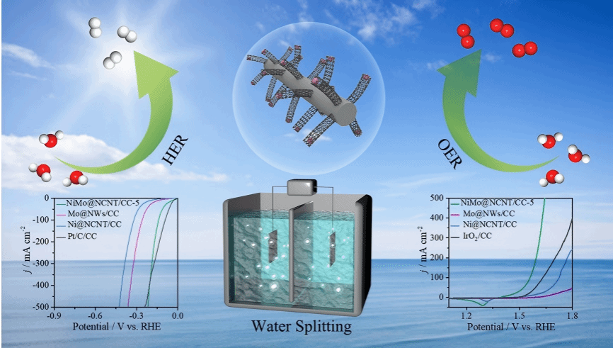 针对碱性工业水电解中催化剂活性不足及稳定性差的关键瓶颈,该研究提出暴露与封装协同的NiMo合金纳米颗粒策略,通过碱性刻蚀结合热解,成功制备出氮掺杂碳纳米管阵列封装NiMo合金纳米颗粒自支撑电极。该电极利用暴露与封装纳米颗粒的协同电子效应,结合碳纳米管的导电网络与保护作用,有效优化了水分子解离动力学及反应中间体的吸脱附行为。基于该电极的电解槽在工业条件下(6 M KOH, 80℃)仅需1.47 V即可达到10 mA cm-2,并在500 mA cm-2大电流密度下稳定运行超700小时,展现出优异的催化活性与稳定性,为高效工业水分解催化剂的设计提供了新思路。
