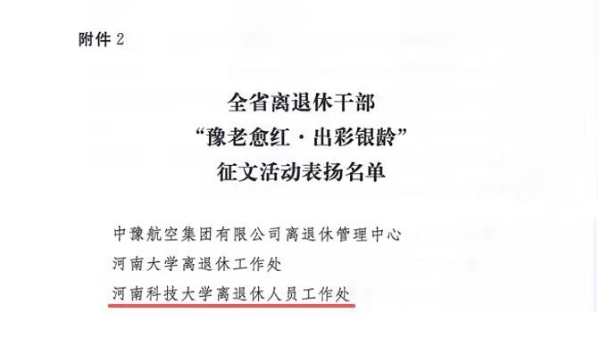 校新闻中心讯 近日,由中共河南省委老干部局主办的全省离退干部“豫老愈红•出彩银龄”征文活动评选结果揭晓,我校4篇征文获奖,学校获通报表扬。